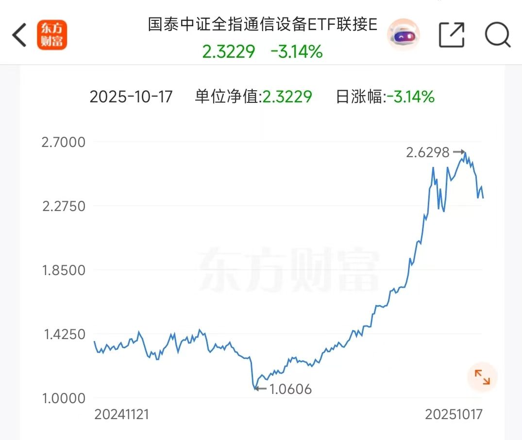 5G-A基站建设加速再添力,今天通信板块一骑绝尘,$国泰中证全指通信设备ETF联接E(022500)$实时估值涨超4.06%,领涨全市场,除了算力需求,5G-A基站的加速建设更是给上涨加了码。工信部最新数据显示,1-10月全国新建5G-A基站超18万个,比去年同期多建6万个,而这只基金持仓的中兴通讯、烽火通信,前三季度5G-A基站设备营收分别增长45%、38%,其中中兴通讯的5G-A基站还入围了欧洲运营商沃达丰的采购名单。$国泰中证全指通信设备ETF联接E(022500)$今年以来收益率超132%,易中天含量高近50%,在同类基金里排名居前,反弹时能快速跟涨5G-A产业链,调整时又能靠光模块等硬核持仓抗跌,现在5G-A建设还在加速,通信板块上涨趋势明确,拿着它能稳稳享受行业增长。#指数操盘手集结令#