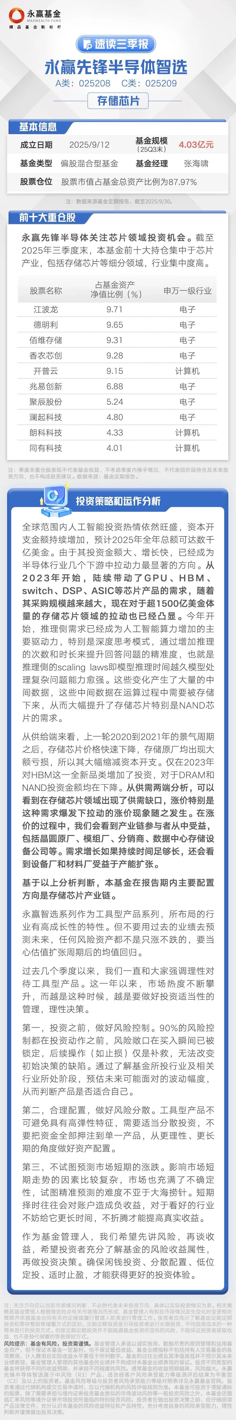 永赢先锋半导体关注芯片领域投资机会。截至2025年三季度末,本基金前十大持仓集中于芯片产业,包括存储芯片等细分领域,行业集中度高。
