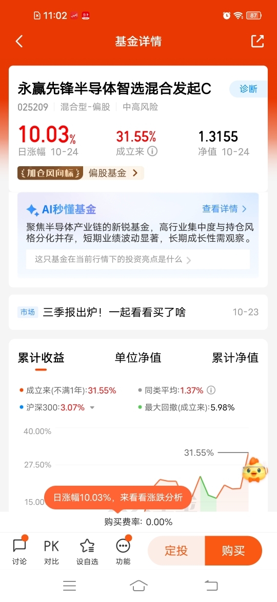 $永赢先锋半导体智选混合发起C$有筹码就有动力,上周五涨幅10.03%,超高弹性