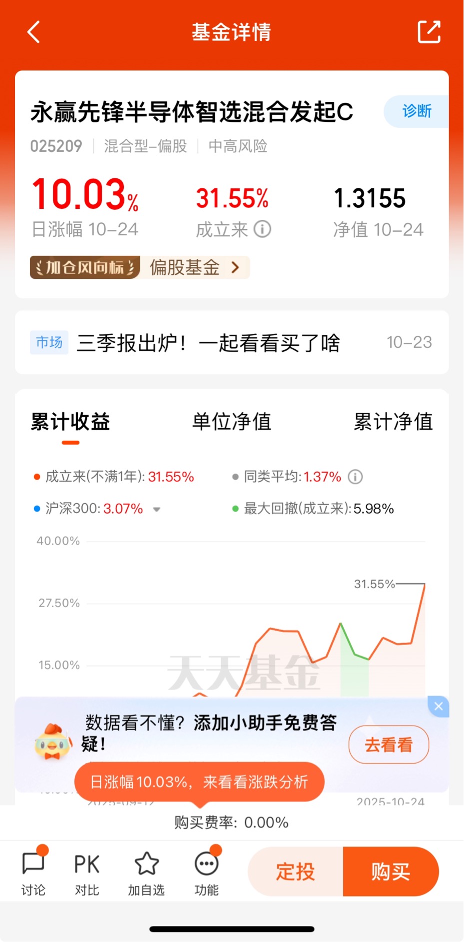 $永赢先锋半导体智选混合发起C$上周五大涨10.03%,近一个月20.12%,同