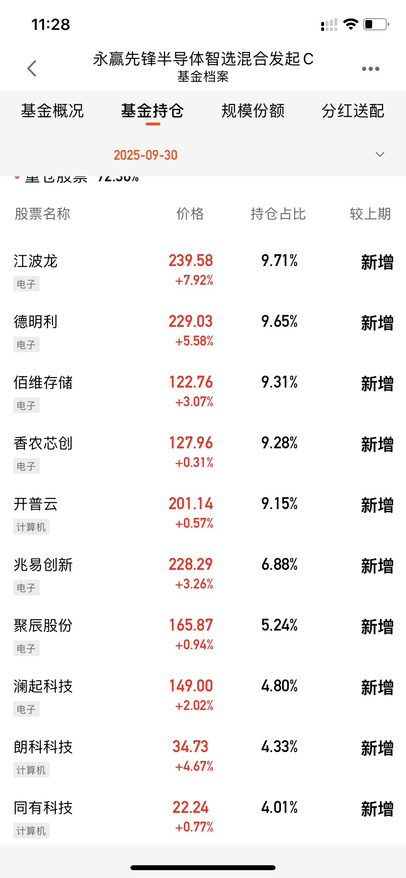$永赢先锋半导体智选混合发起C$ 上周五大涨了10.03%,看目前持仓股飘红的表现,涨势持续啊,果然还得是勇敢的人吃肉啊!永赢先锋半导体专注半导体产业链,聚焦存储芯片产业链,行业集中度高,存储芯片三连涨,今日盘中存储器指数涨超2%,存储芯片价格持续上涨,值得期待了!#沪指再创十年新高!接下来你会如何操作?#