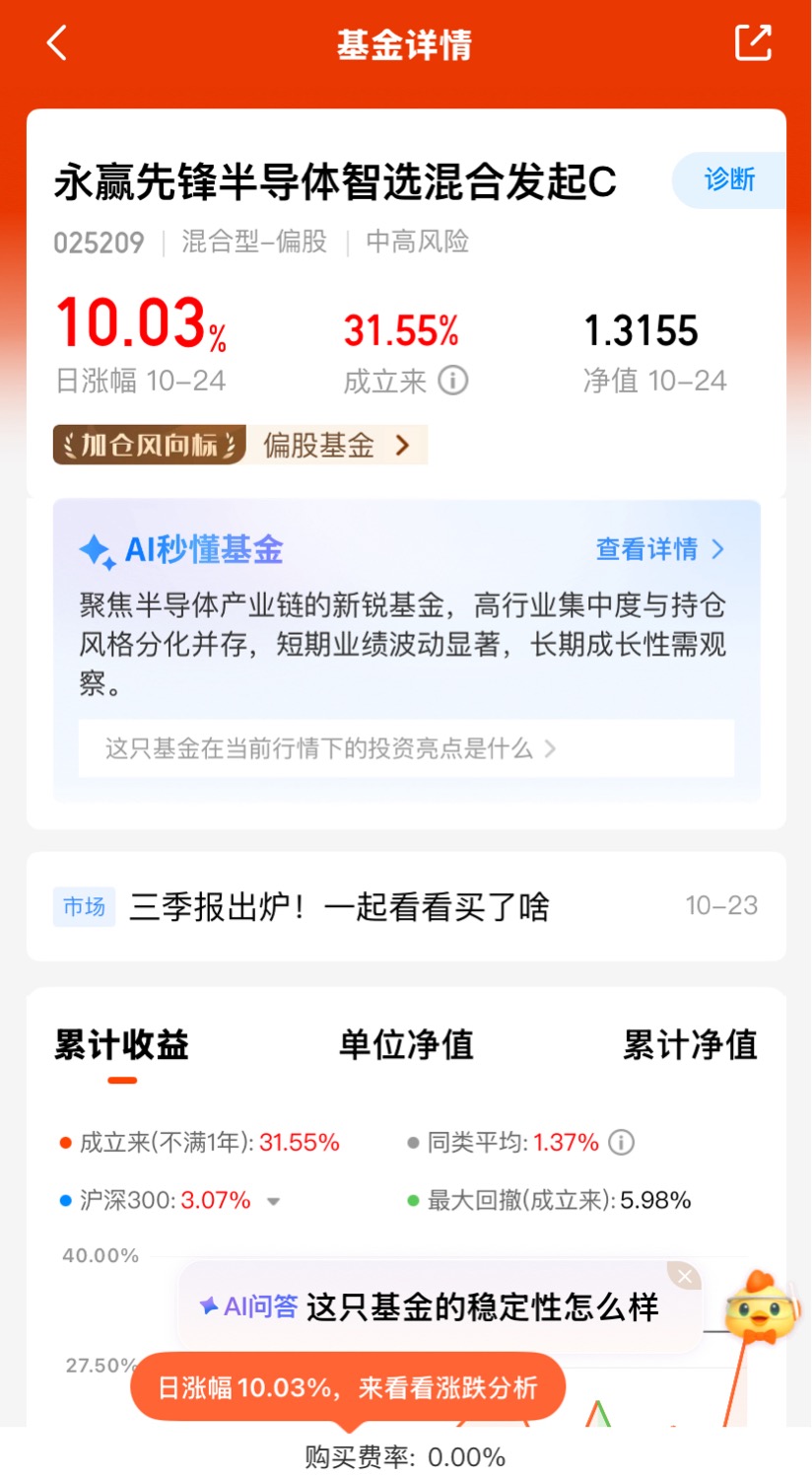 $永赢先锋半导体智选混合发起C$上一个交易日大爆发暴涨10.03%太强了,今天午
