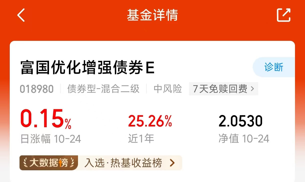 今天大盘虽然涨了,但总感觉不太稳,不知道你们是不是也有这种感觉。我觉得这种时候还是要拿点固收+做搭配。比如像$富国优化增强债券E$(018980)这种,一年25%的收益,最大回撤不到8%,整体就能稳得住,而且怎么说,挣钱也能挣点。你不能指望踩准每一个节奏,当你踩不准的时候,这种仓位说不定就能给你保个底。#美方“不再考虑”对中国加征100%的关税#