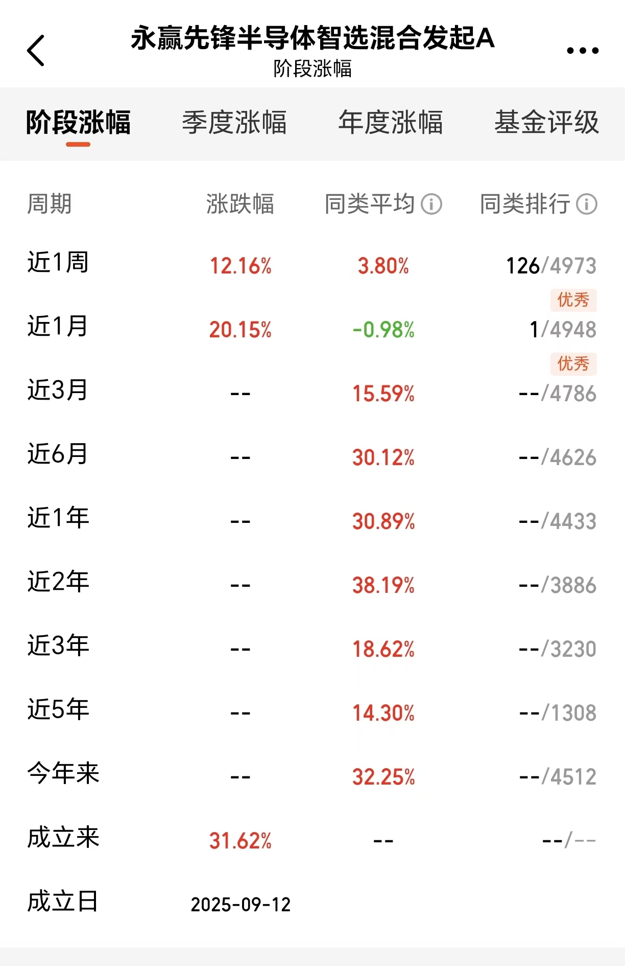 作为9月新发行的基金,永赢先锋半导体智选混合发起C(025209)精准把握行业拐点,业绩表现极为亮眼:上周五单日大涨10.03%,近一周反弹12.15%,近一月上涨20.12%,同类排名第一,成立以来收益达31.55%。如此强劲的爆发力,源于其对存储产业链的深度覆盖——基金不仅布局中国卫星、航天电子等“国家队”龙头,还捕捉微纳星空、深蓝航天等民营创新企业机会,实现全产业链配置。