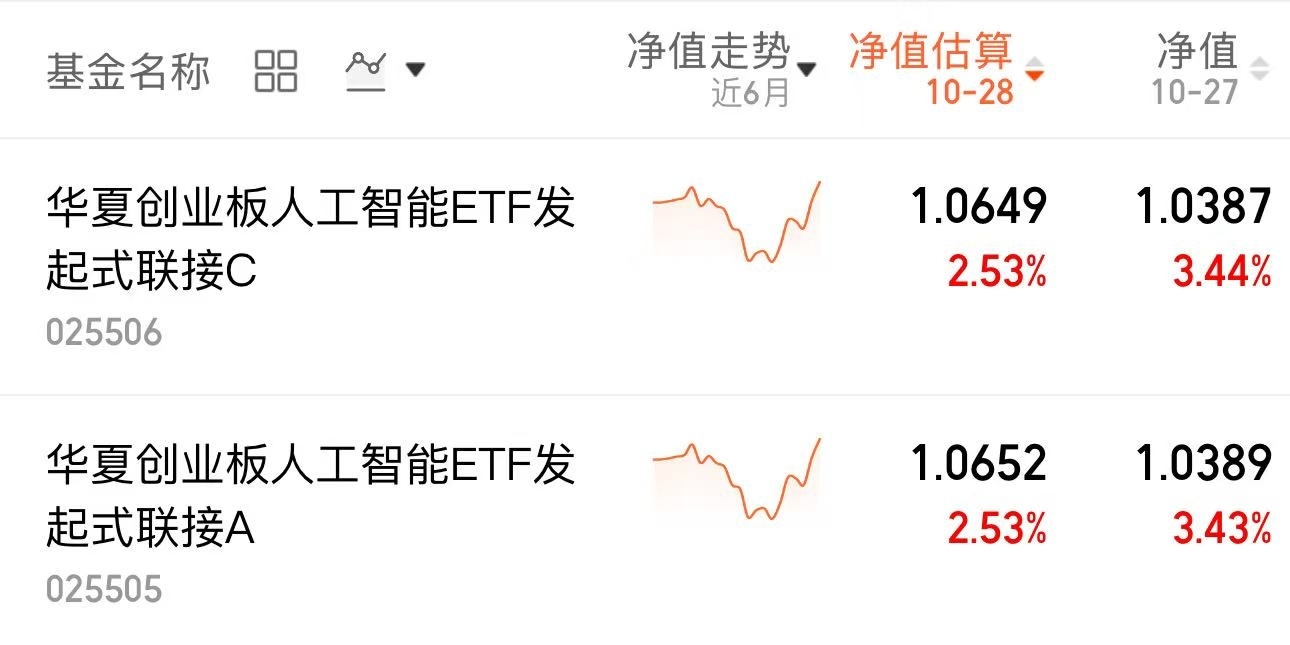 连红2天,昨天收益3.44%,近一周收益12.79%,当前上涨2%+,人工智能赛道是我最看好的赛道,继续拿$华夏创业板人工智能ETF发起式联接C$