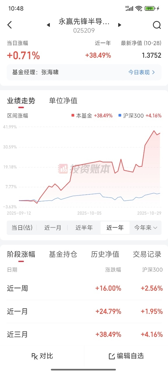 银行理财经理给我推荐了永赢先锋半导体C025209今天估值又涨了0.71%,这只是新基金刚成立没多久收益已经37.52%了,大盘企稳了,现在买也不晚啊,车上的拿着就行了。
