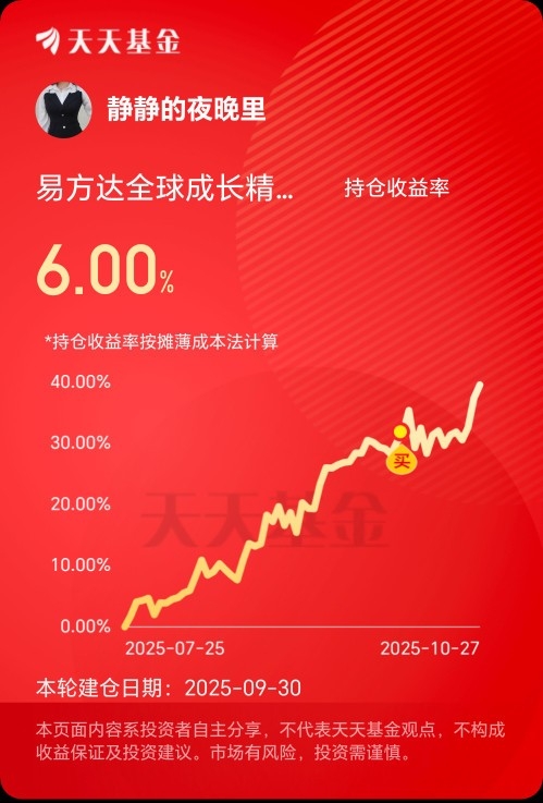 今日大盘行情火热不断,美股市场涨幅力度也非常出色,而科技这波上涨行情,无论是海内外都有很大机会!对以我持仓的:易方达全球成长精选混合(QDII)人民币C来说,持仓布局A股、港股、美股龙头科技,目前我的持有收益率为6%,自从入手之后,就一直保持稳定上升趋势,根本无需担心调仓操作,这也是刚好说明了,基金经理具有很好的前瞻能力,对市场行情有着精准的把握,我觉得跟着他挺安心的,后期慢慢再定投一些!