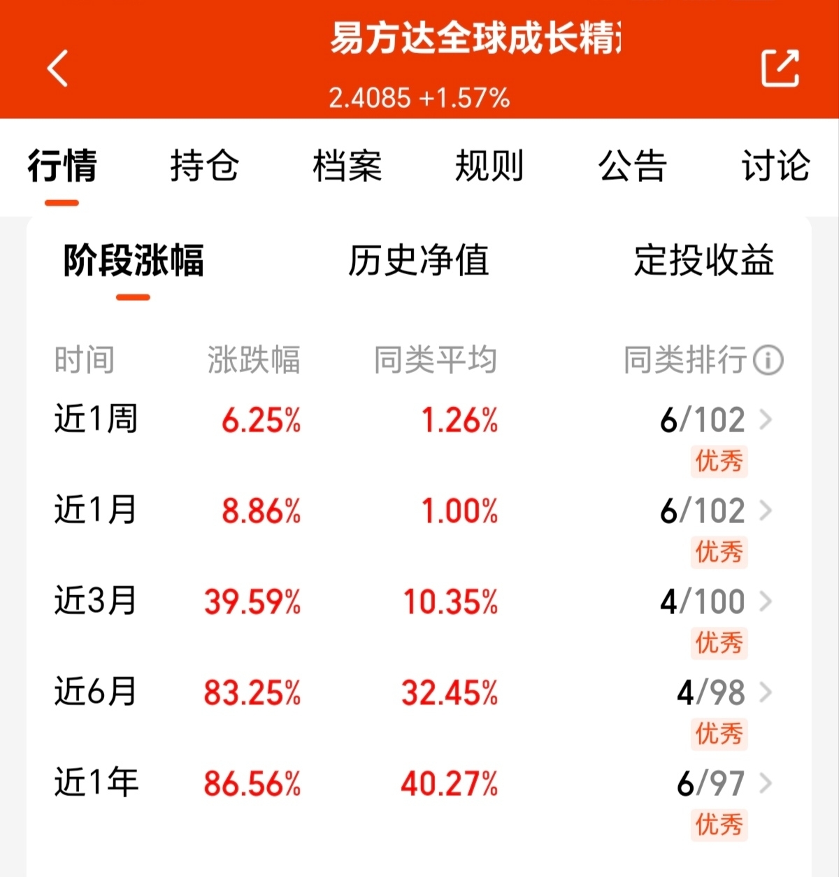 隔夜美股市场再次发力上涨,三大指数再创新高度,而今日A股沪指再度站上4000点,市场行情一片火热,在这种行情之下,我觉得全球科技都有上涨机遇,所以我会选择: 易方达全球成长精选混合(QDII)人民币C一键把握全球科技龙头市场,充分享受科技成长机遇,近一年涨幅超86.56%,并且随着降息周期开启,全球科技类资产都有望受益,我也将长期看好这一赛道!