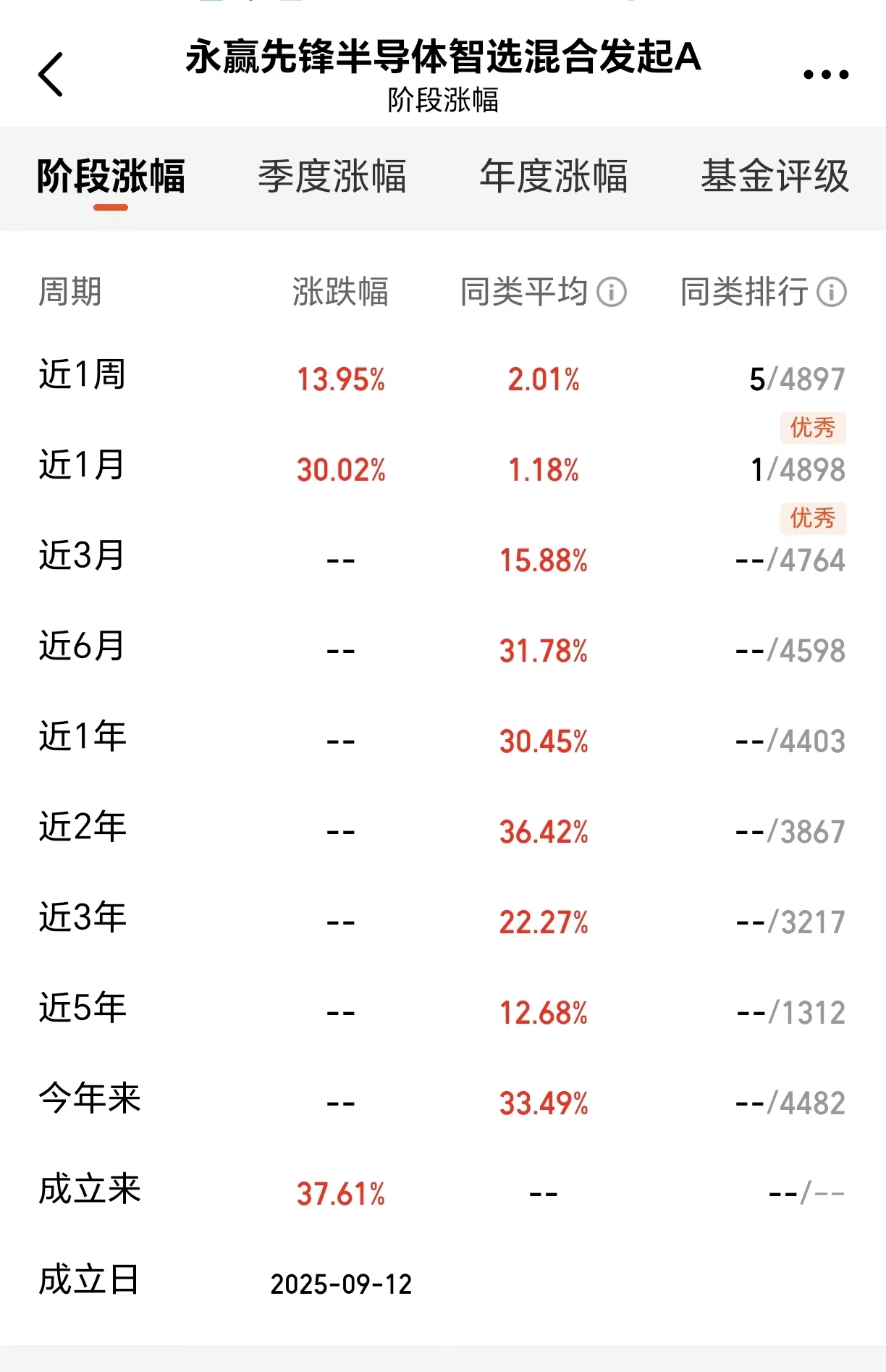 这款基金以行业景气度为投资逻辑核心,紧密跟踪下游芯片需求变化,从各类应用场景的爆发中挖掘投资机会。当前,存储芯片行业迎来全面涨价周期,成为基金布局的核心方向。全球AI浪潮的兴起,推动算力需求急剧增加,存储芯片作为关键支撑硬件,市场供需出现严重错配,价格进入持续上行通道。由于AI需求仍在高速增长,而存储芯片产能扩张需要时间,这一景气周期有望进一步延续,为投资提供了坚实基础,永赢先锋半导体智选混合发起C(025209)精准锁定这一蓝海市场,深度聚焦存储芯片赛道。作为9月新发行的基金,它业绩表现十分亮眼:上周五单日大涨10.03%,周一强势上涨6.36%,近1周上涨13.94%,近1月以29.97%的收益领跑同类,成立以来累计收益达37.52%。