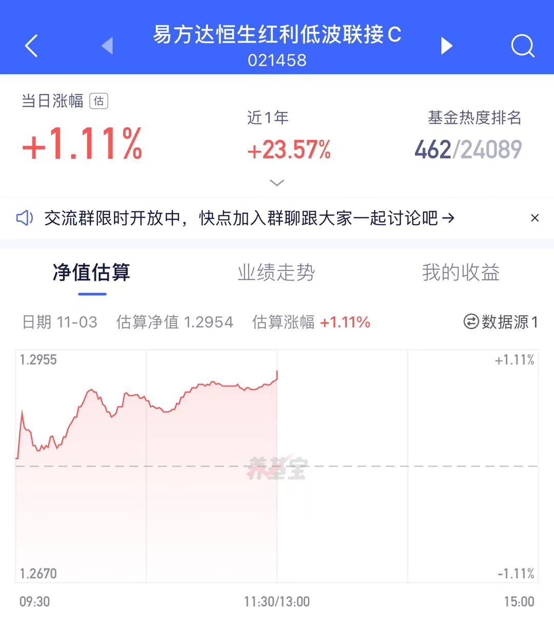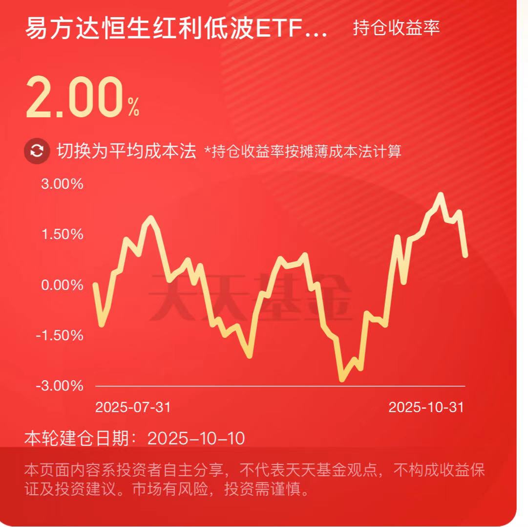 前期领涨的科技板块连续回调,市场分歧加大。为应对可能出现的风格切换,我选择提前布局部分红利资产--恒生红利低波C,今天涨势喜人,我已有2个点的收益。红利股估值低、波动小,在震荡市中更显稳健,能有效平衡整体持仓结构,进可攻、退可守。