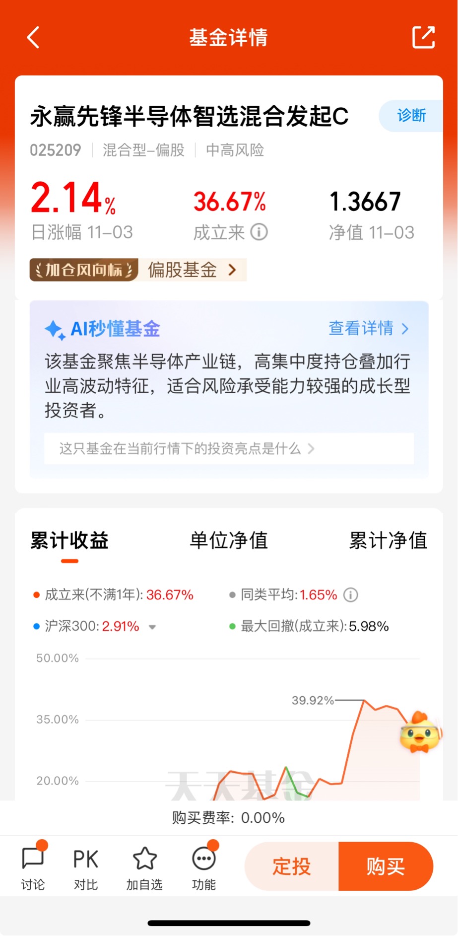 $永赢先锋半导体智选混合发起C$昨天又拉涨回来2.14%,近一个月收14.35%