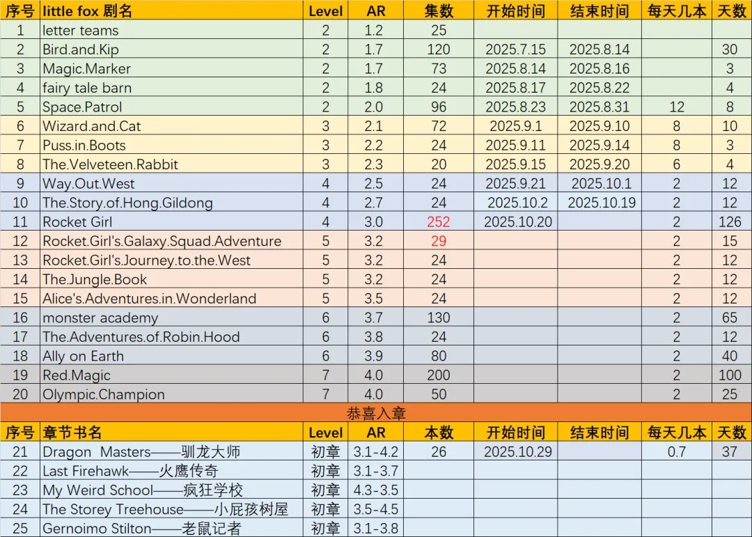 后面打算,littlefox刷一部,找个AR差不多的章节书,给他换换口味。