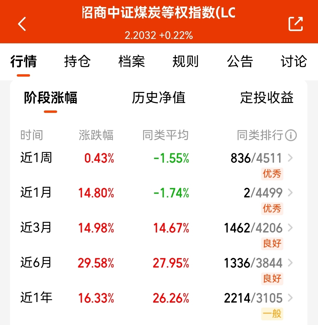 尤其是这支$招商中证煤炭等权指数(LOF)C$ ,跟踪煤炭板块,近1个月已经涨了14.80%了,近半年收益29.58%,目前也已经连涨3天,相对多数科技板块,这赚钱效应有所回归;