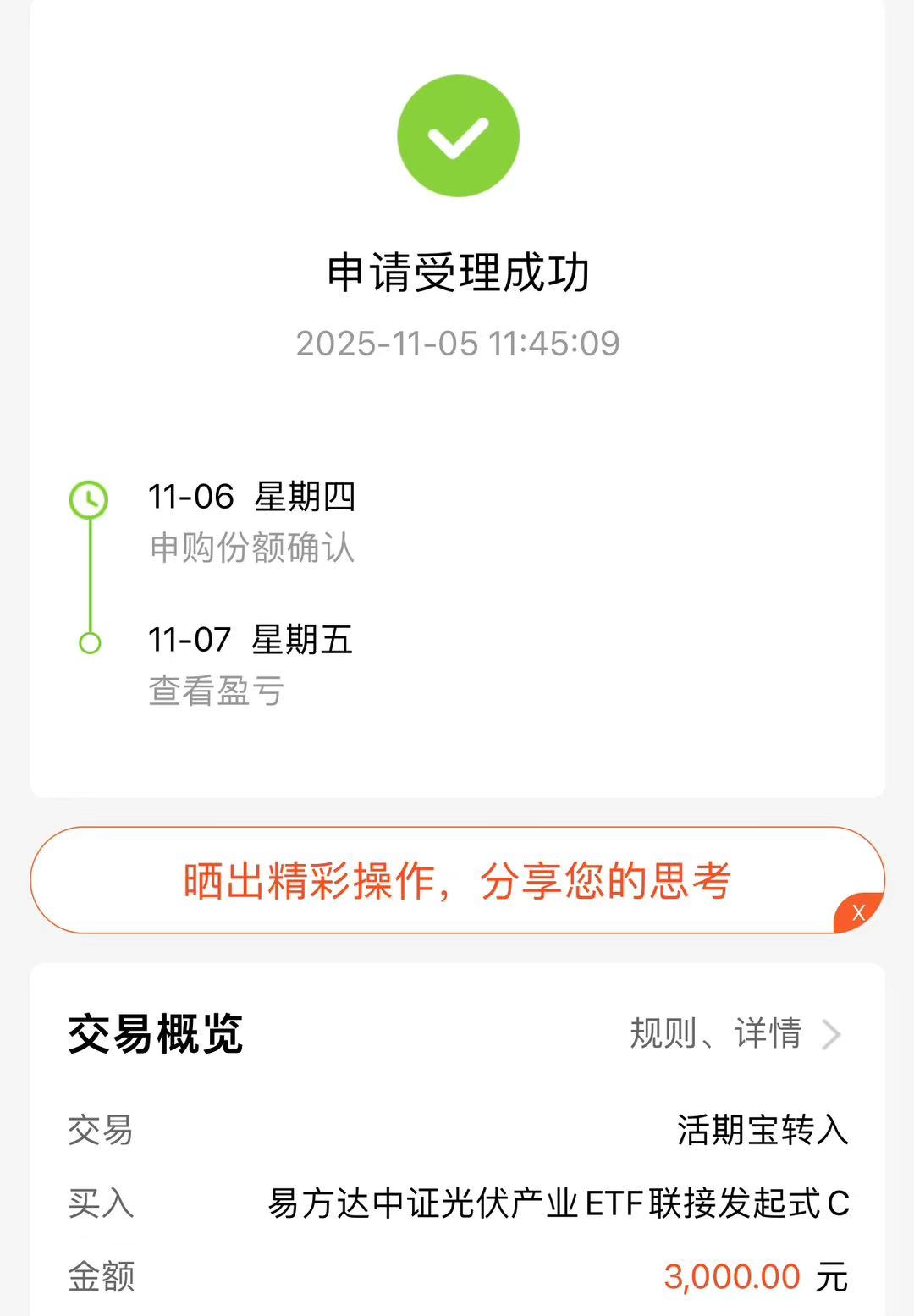 今日早盘三大指数齐跌,午盘上证与创业板率先翻红,市场情绪回暖。光伏板块经历前期回调后估值已具吸引力,叠加政策端持续扶持与装机需求旺盛,长期成长逻辑稳固。本次加仓3000元,趁低布局未来能源赛道,静待光伏迎来新一轮反弹。