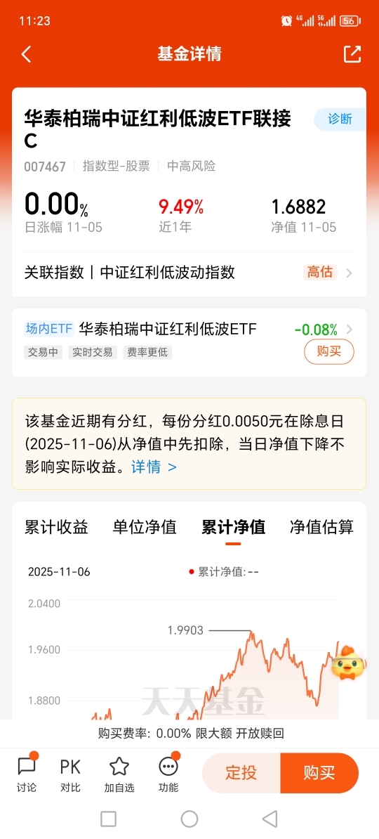 今天红利低波板块基本没动,日涨幅是0%,但这板块最近属于“稳字当头”的类型——毕竟现在市场波动不算小,红利低波本来就是挑那些分红稳、波动小的公司,像消费、金融这类刚需行业占比多,行情再晃也不容易“坐过山车”。这种时候我更愿意拿华泰柏瑞,它就是跟着红利低波指数走的,等于把这些稳当的公司都打包了。而且这基金近1年涨了9个多点,买的时候还没手续费,分红也刚发了点“小红包”,想求稳又想有点收益的,这只真的适合当“压舱石”!$华泰柏瑞中证红利低波ETF联接C$ #4000点 到底要不要止盈?#