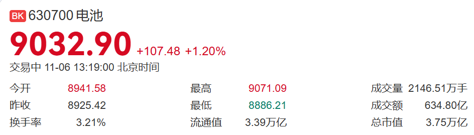 今天盘面,电池继续昨日上攻态势,截至发文,板块已涨1.2%,个股表现也比较亮眼,科士达涨7.81%,孚能科技、厦钨新能涨超3%,南网储能、当升科技涨、新宙邦、德业股份涨超2%。