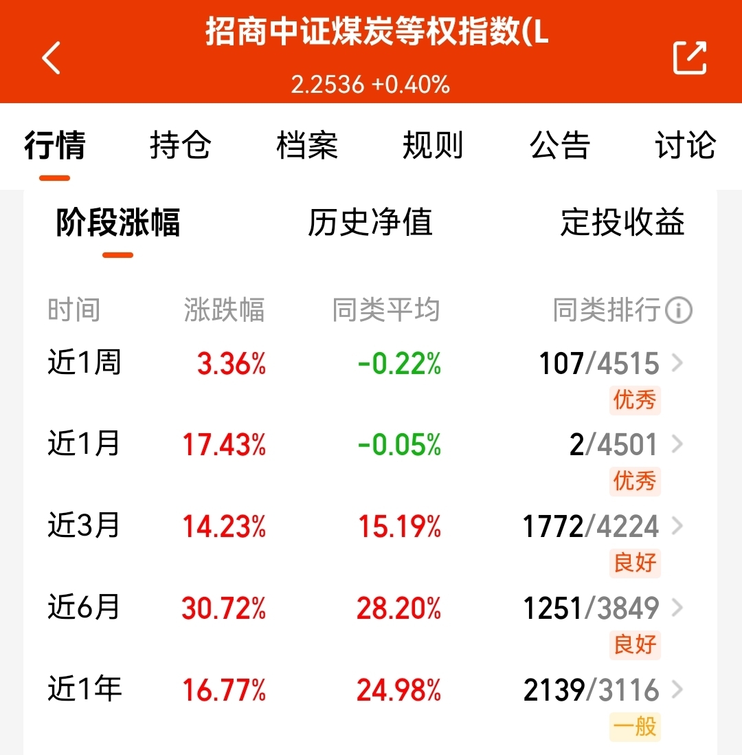 尤其是这支$招商中证煤炭等权指数(LOF)C$ ,目前也已经连涨5天,近1个月收益17.43%了,已经跑赢大多数科技板块了;