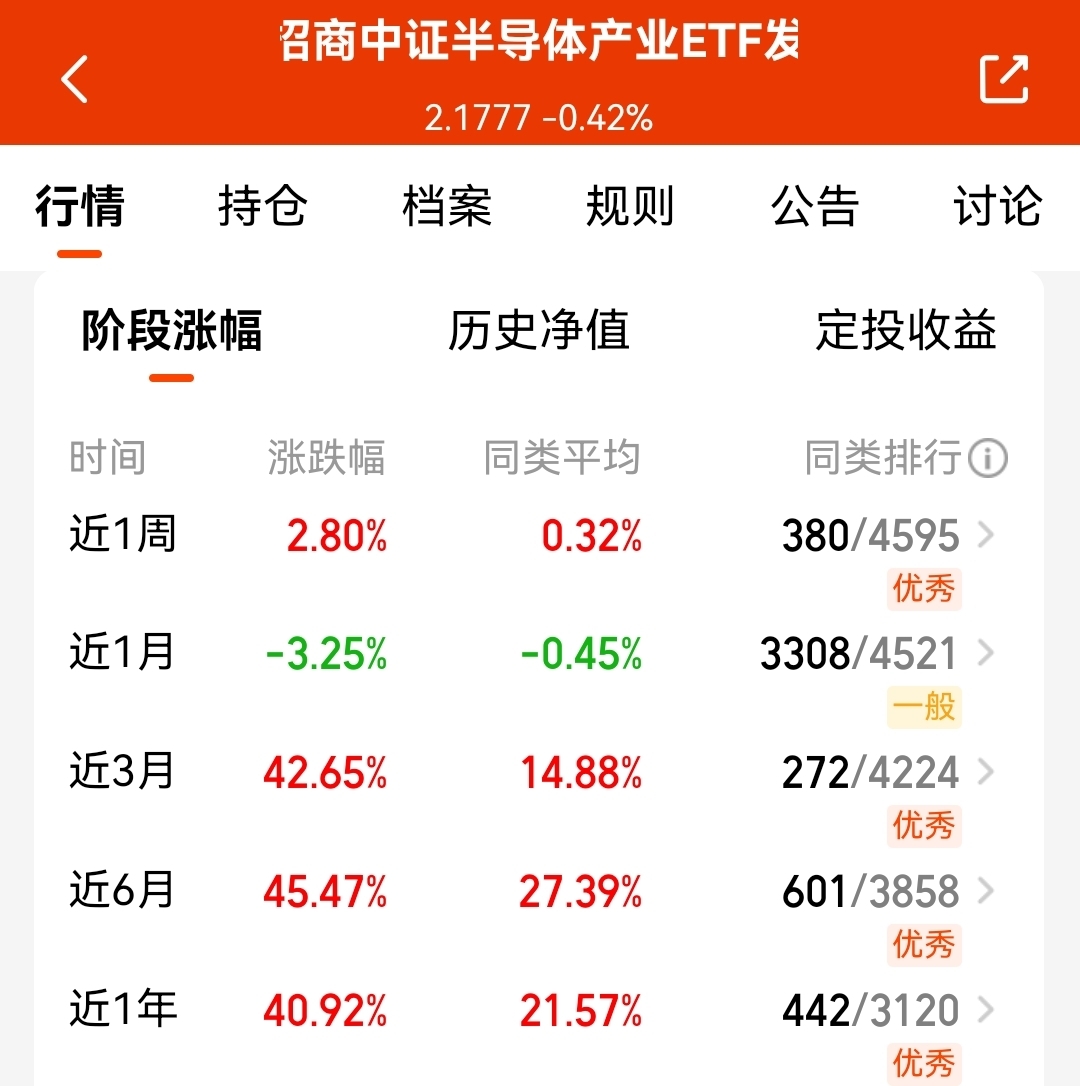 我比较看好这支$招商中证半导体产业ETF发起式联接C$ ,目前估值依然上涨,近3个月收益42.65%了,相对多数板块,也是有一定超额了;