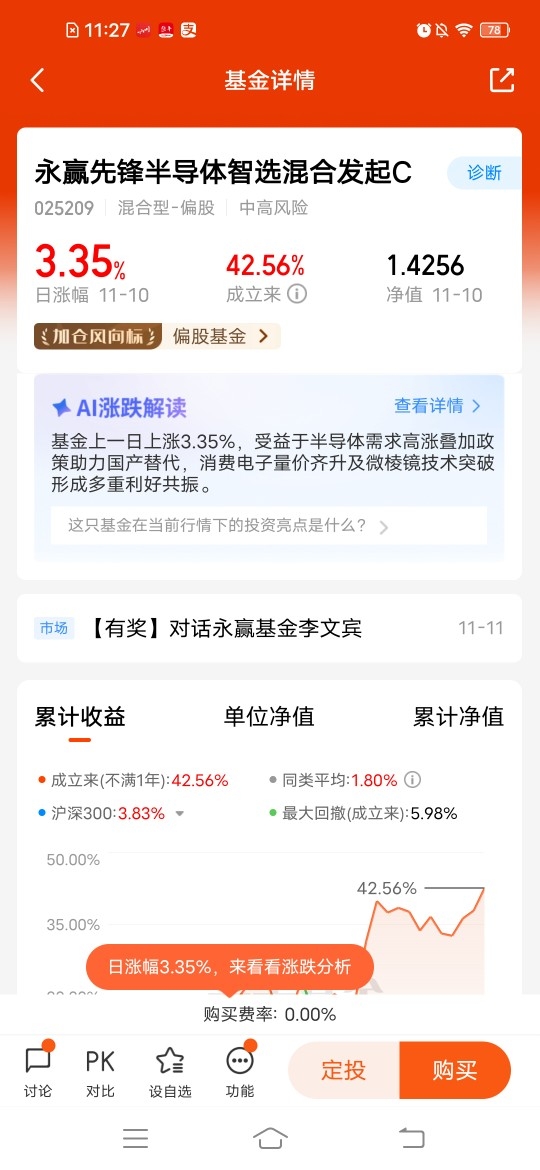 $永赢先锋半导体智选混合发起C$赛道好反弹能力强,昨天涨幅涨幅3.35%,刚成立