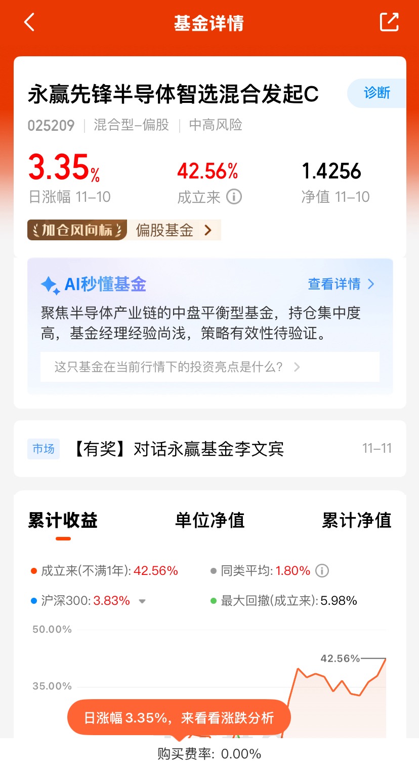 $永赢先锋半导体智选混合发起C$昨天大涨3.35%,成立仅2个月涨幅超过42个点