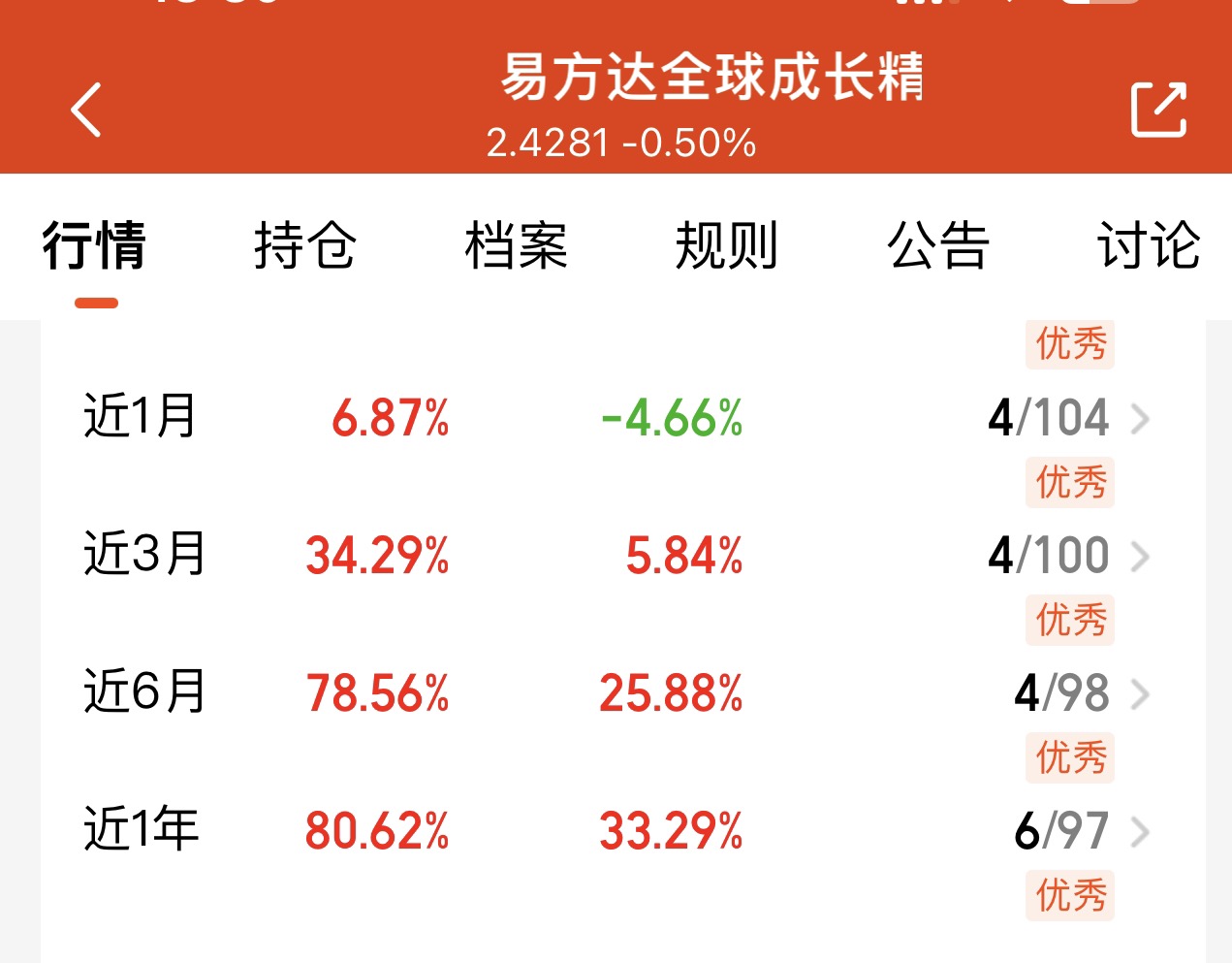 易方达全球成长精选混合C真是一只能“稳健增长、精准布局”的全球配置基金。长期榜单名列前茅,净值走势稳中带强,比同类产品更顺滑,回撤控制也非常出色。核心优势在于基金经理的前瞻眼光和灵活调仓能力:一季报精准加仓港股,提前捕捉估值修复机会;二季报果断转向美股AI算力板块,把握产业增长脉络;近期美股回调时,又快速调仓控风险,稳住收益。