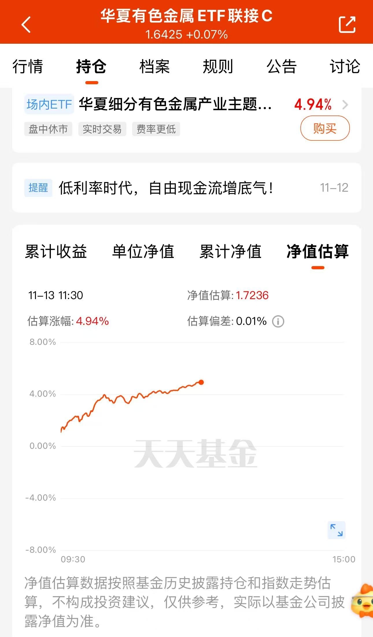 今天手里的基涨幅最好的就是这只有色了,这基专注持仓有色板块龙头,加上老美降息预期加强,黄金避险属性还是要有的,上涨动力足,今天反弹超4%,近6天5天上涨,近3个月收益34%+,$华夏有色金属ETF联接C$有望带我的伙伴们赚取超额收益啊