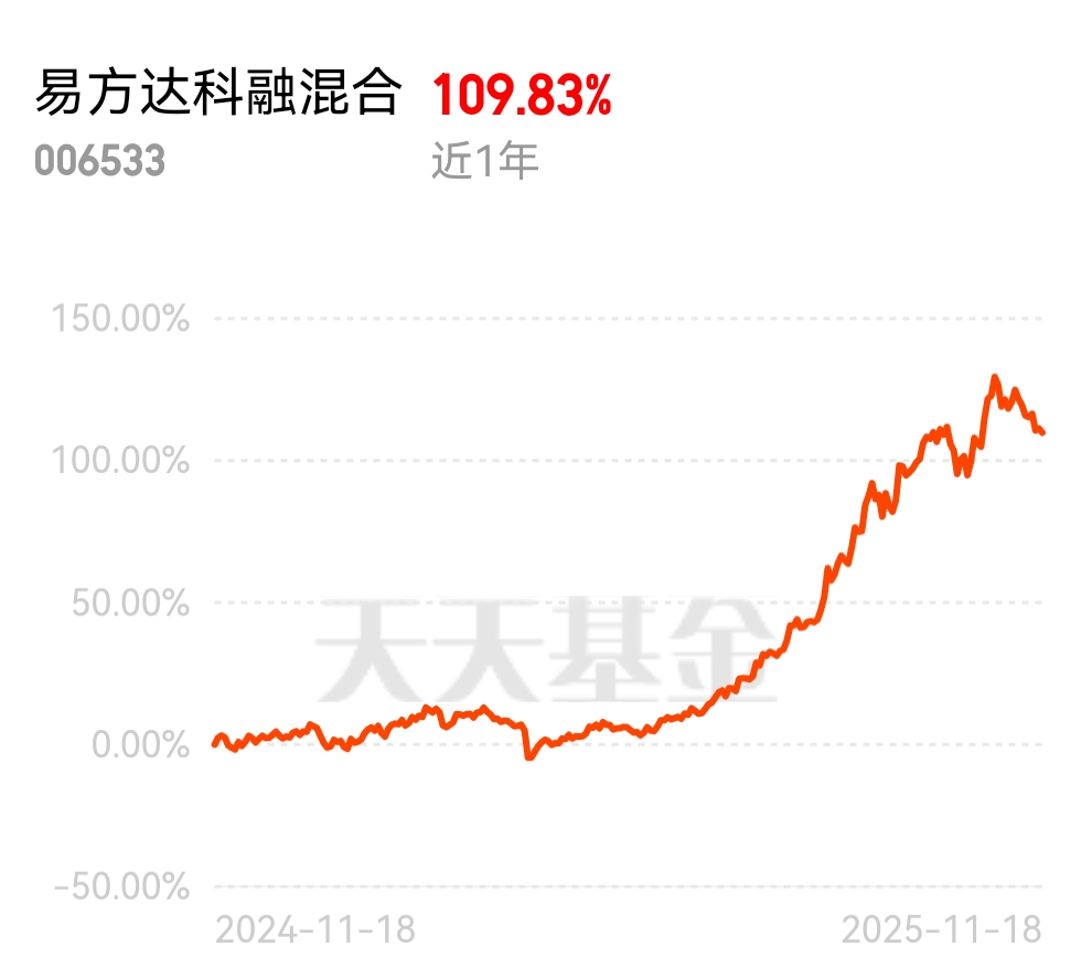这支$易方达科融混合$ 目前也是持仓大科技方向,近1年收益已经涨了109.83%了,相比于押注单一科技赛道,近期回撤风险高,而本产品产品不仅买了科技,这支还额外搭配了部分反内卷相关的新能源板块,均衡分散到科技、制造、消费等;