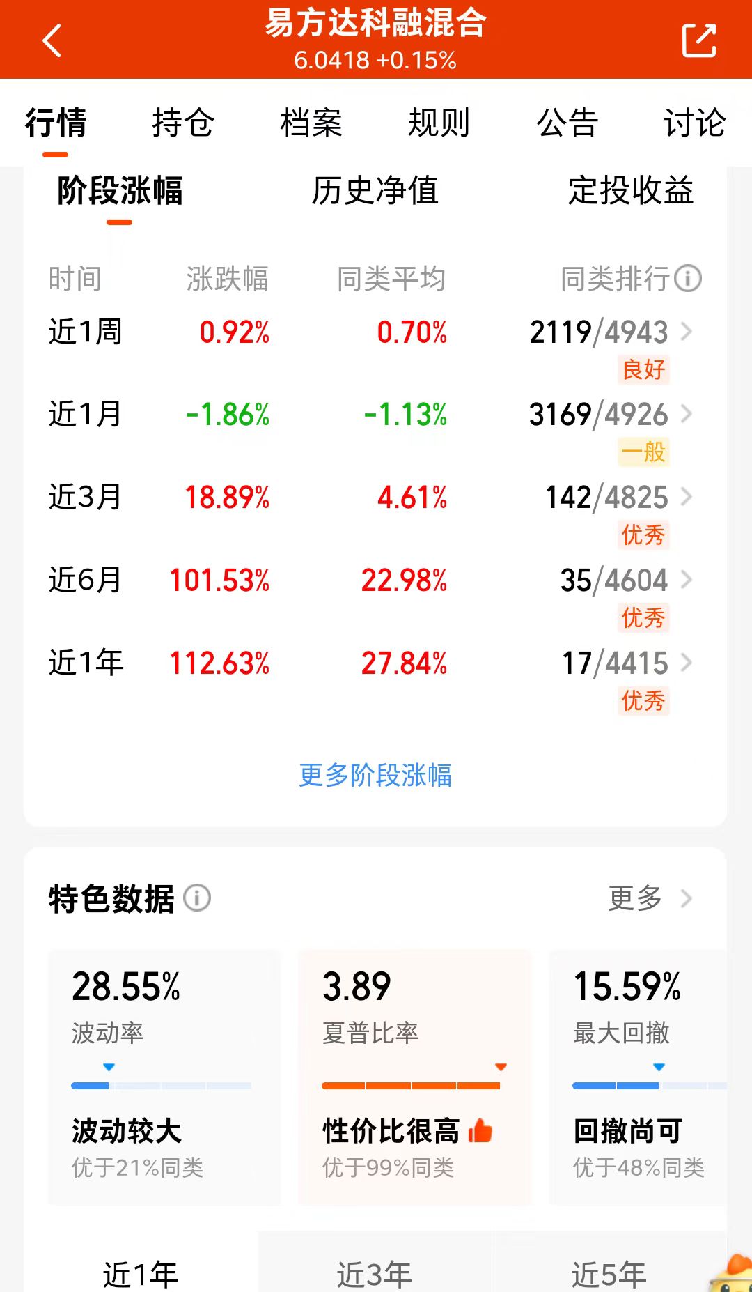 最近股市行情震荡,科技板块细分多,板块分化,所以说相比单一赛道,还是均衡配置的更有优势,比如易方达科融混合,不仅买了弹性大的科技,还买了反内卷相关的新能源相关的,也就是说深度参与了科技、新能源、军工轮动配置,夏普比率优秀,可以说是成长里的均衡之选。