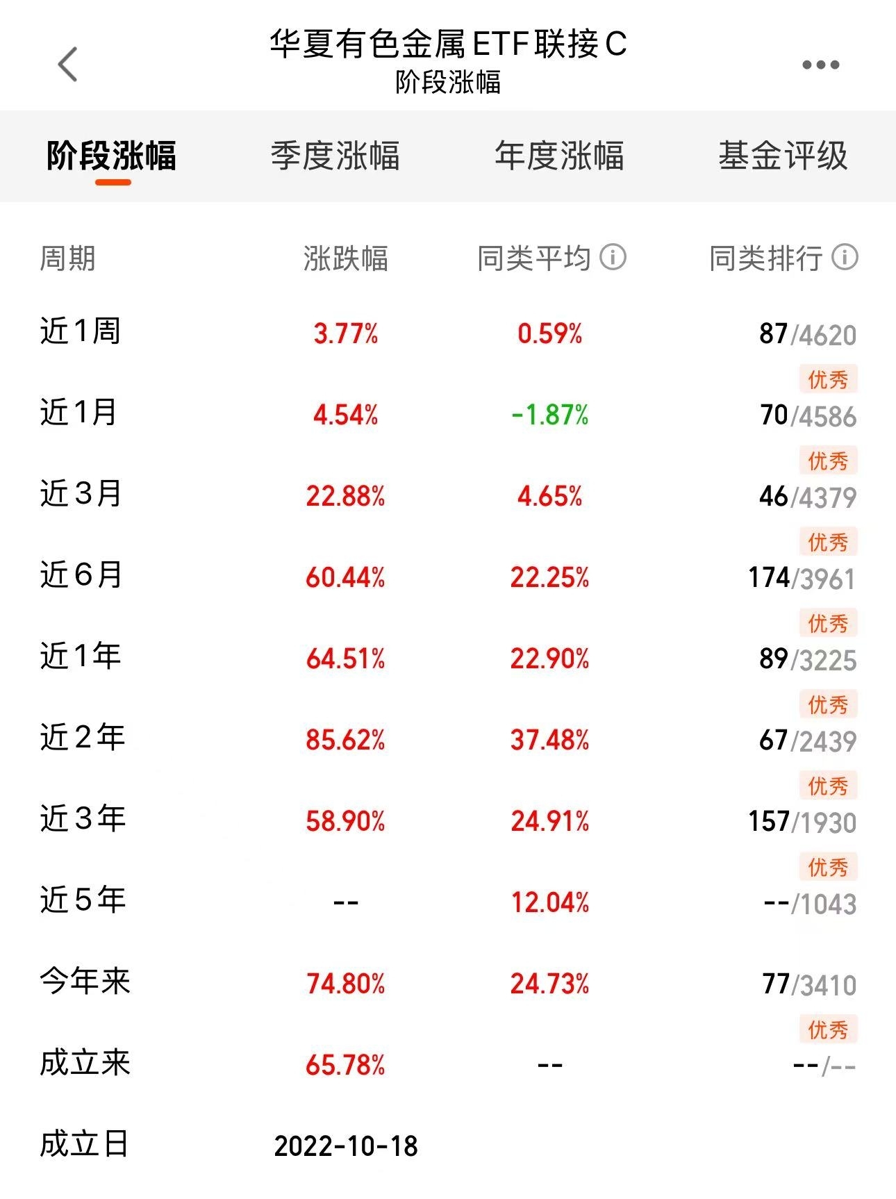 连红两天,当前上涨1%+,近6月收益超60%,个阶段业绩都很优秀,$华夏有色金属ETF联接C$上涨势头不错,拿稳了