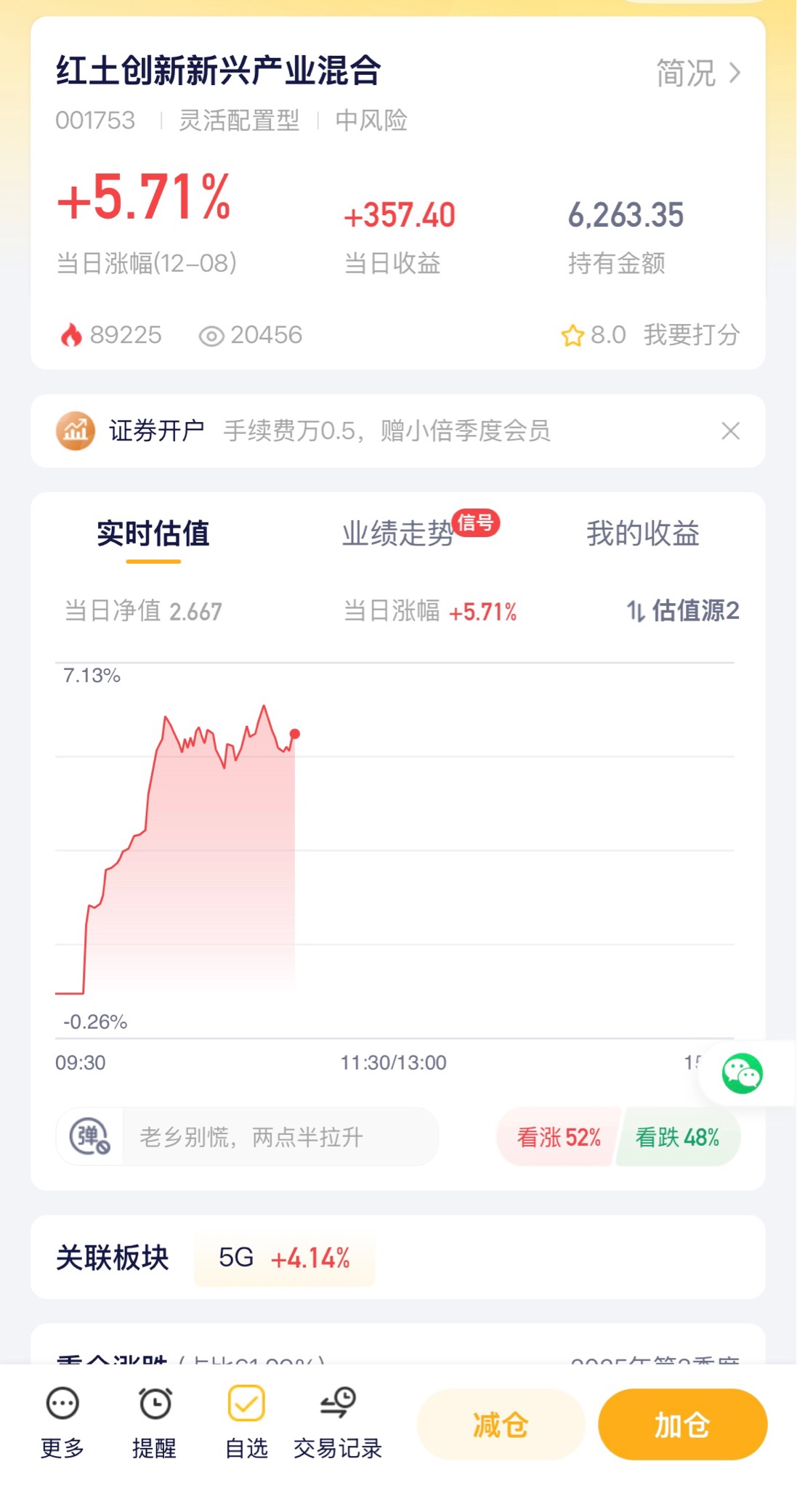 $红土创新新兴产业混合C$ 早盘看到中际旭创新易盛全面起飞,就知道今天账户稳了。打开估值一看果然涨了6%+,这基真是命中带财。最近AI算力需求太猛了,800G光模块供不应求,英伟达产业链的确定性就是强。可惜A类手续费有点心疼,听说C类刚上线,准备把加仓资金都换过去,省下的费率都是纯利润。