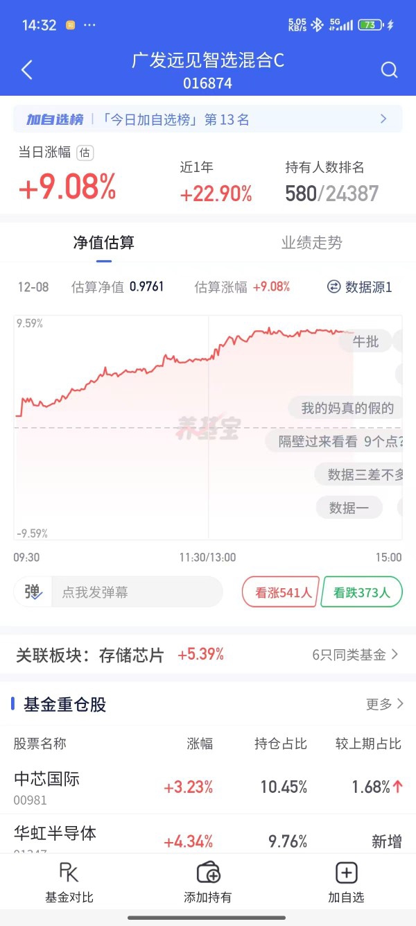 拍断大腿!早上还在犹豫,下午广发远见智选C就直接拉了9个点。同样是押存储,我手上那个才涨4%,弹性差太多了。下次认准了,要买就买这种进攻性拉满的。$广发远见智选混合C$