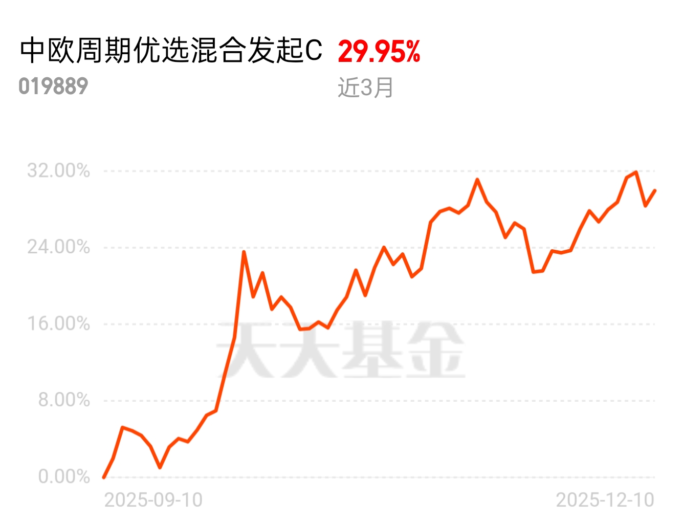 中央强调加强战略性矿产保障,政策红利持续释放,资源板块长期被看好。中欧周期优选混合发起 C 近 3 个月涨 29.95%,在周期资源类基金里表现优异,短期上车不亏。