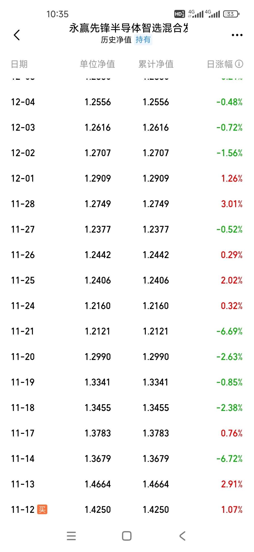 今天周五,回本6000多,很心满意足了,离回本还差2.9万。我买的时候马上最高点,1.42入手,马上回撤,期间两次降6点多,第一次买基金,我就不信不能回本。亏个十万八万还是能接受的,但也愿意像那些一年100%涨幅的一样,心里暖和和有信心。