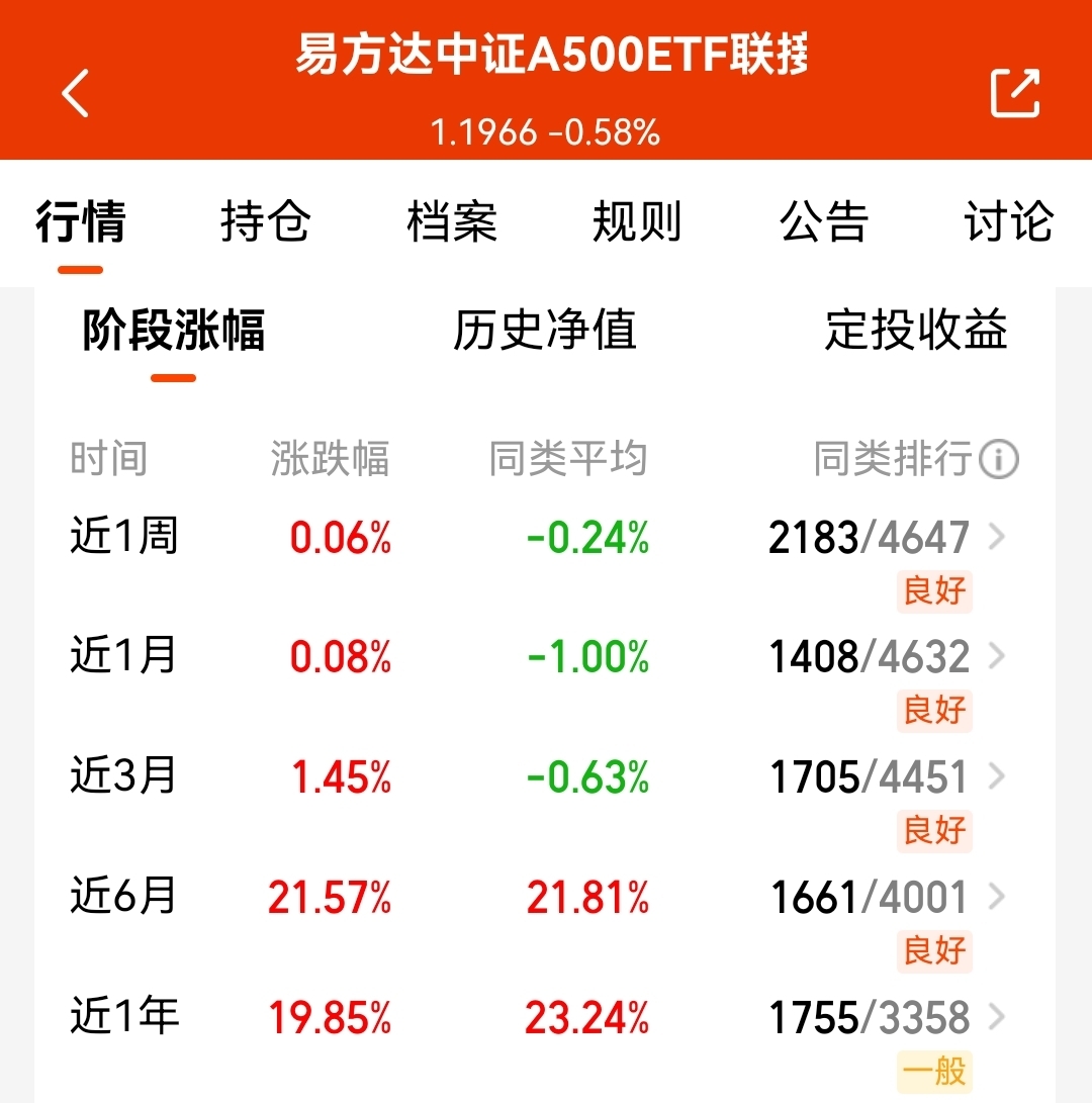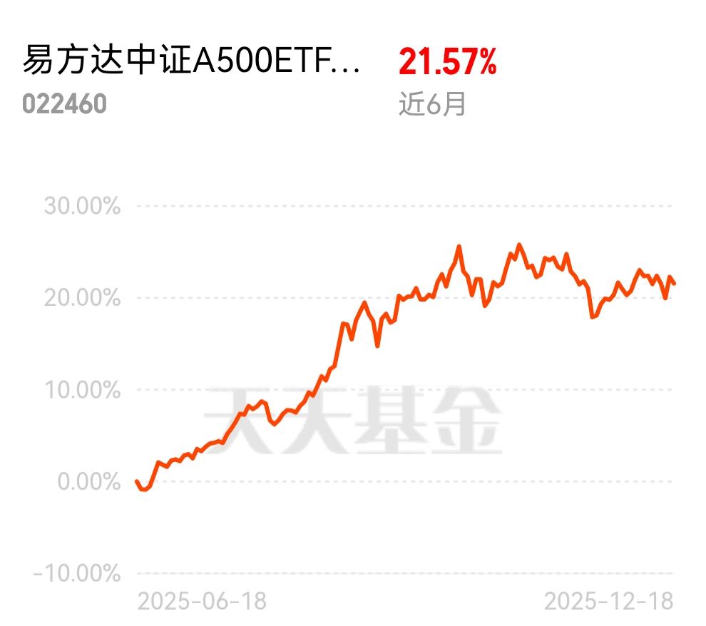 我比较看好这支$易方达中证A500ETF联接C$ ,跟踪中证A500,近半年涨了21.57%,而且,年底风险释放完毕,中证A500上市一年,吸引近150个险资账户持有,受养老金、保险、机构等长线投资者青睐,我觉得有坚定资金底舱支撑,指数长期行情还能持续!