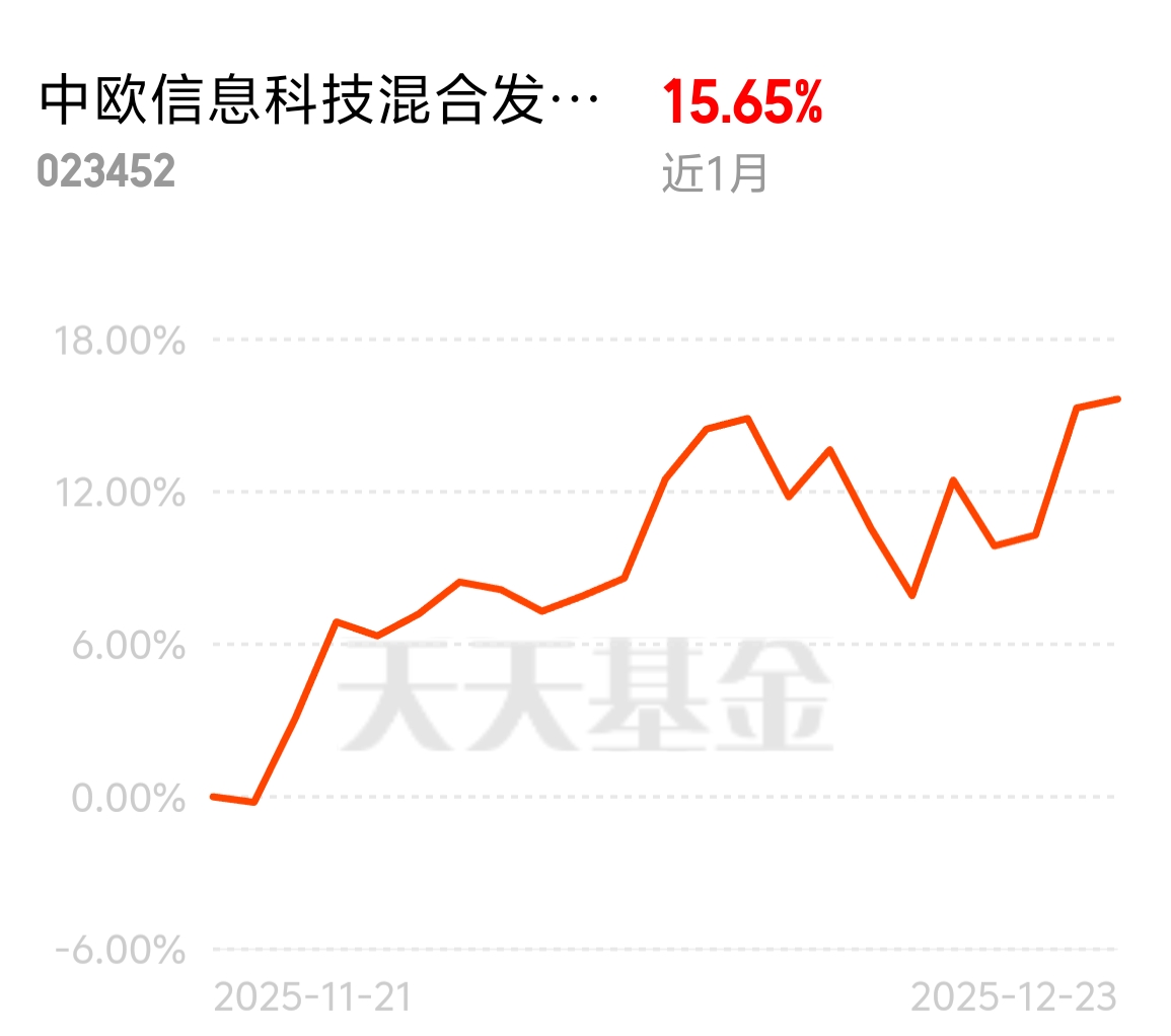 12 月国产万卡算力集群密集发布,AI 硬件突破提速,中央经济工作会议力挺科创。中欧信息科技混合发起 C 近 1 个月 15.65%,短期抓政策风口配置值,长期踩数字经济主赛道享新质生产力红利。$中欧信息科技混合发起C$