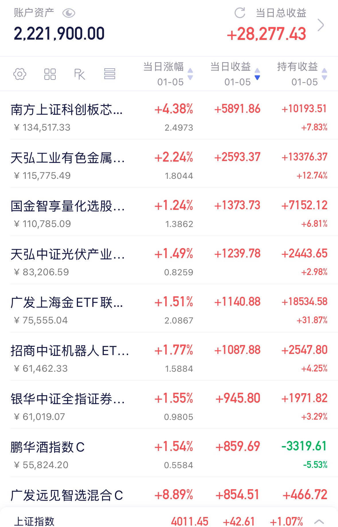 2026年第一天,大盘站上4000点!从上涨的板块来看,依旧是强者恒强的局面,科技、有色、新能源涨幅居前,港股创新药今天也展开强势反攻。多点开花的行情就不做选择题了,我继续配置均衡风格的兴全品质甄选,成分股主抓龙头,科技、新能源、创新药一键打包,去年上涨52.12%,同期沪深300指数上涨17.66%,超额收益能力较强。一路稳稳上涨也没错过主线交替,可见基金经理对热点风口的把握还是比较准的,不想踏空行情,又不知道科技怎么投的,选这只均衡科技基很可以,我今天继续再加一份。