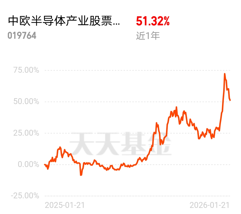 当下半导体行业景气度直接拉满,1 月 19 日 15 时 48 分长征十二号送银河航天 19 组低轨卫星入轨,这是长征第 628 次发射,北京火箭大街也同步竣工,商业航天赛道超明朗,$中欧半导体产业股票发起C$ 近 6 月 51.59% 的收益,妥妥跟上产业节奏