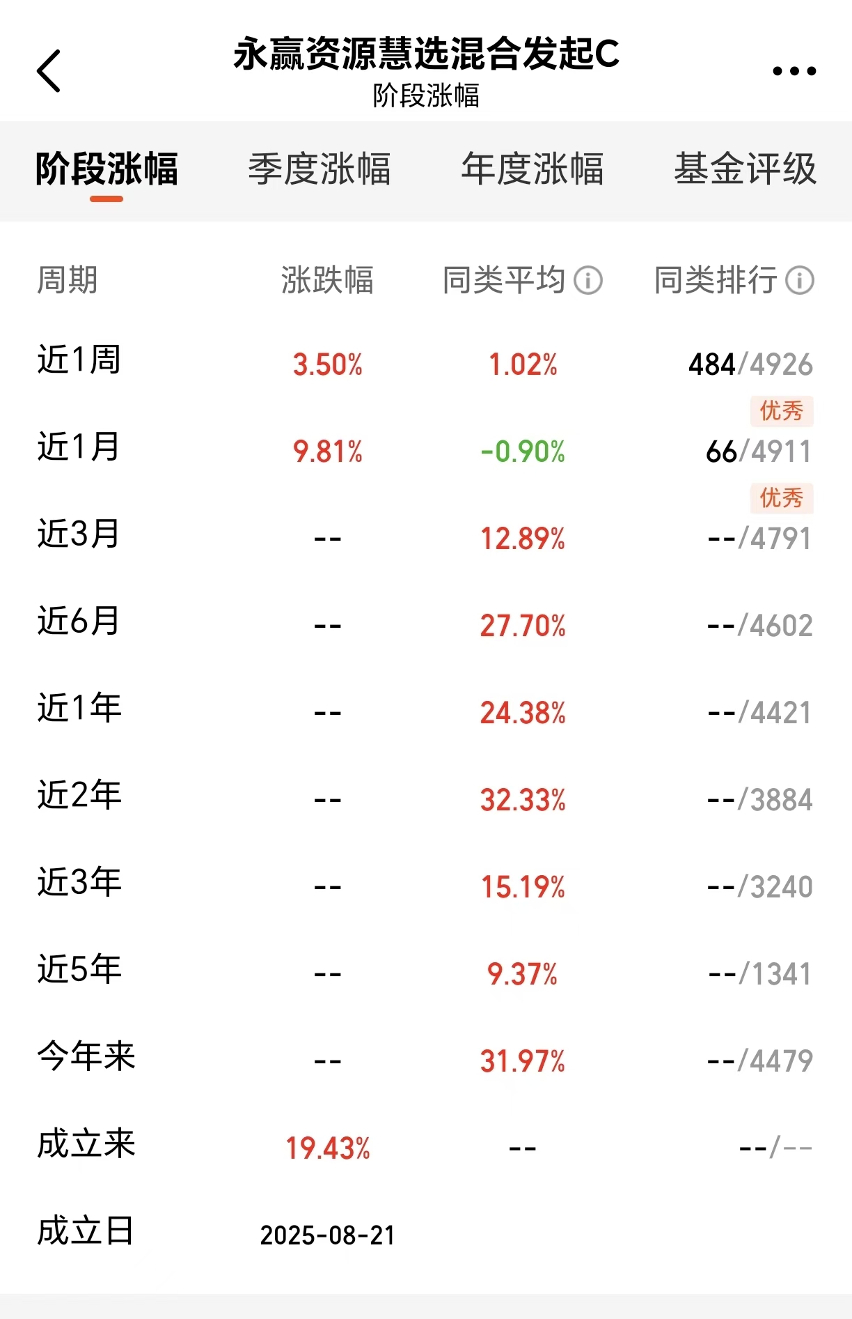 永赢资源惠选混合发起C(025217)专注布局钢铁与有色金属行业,恰好踩中了此次左磷右锂引领的资源行情。作为8月末才成立的新基金,它的业绩表现堪称惊艳:近1月上涨9.81%,成立以来累计收益已达19.43%。在短短几个月内便实现如此可观的收益,充分说明其投资方向与市场趋势高度契合,也展现了强大的行业把握能力和个股精选能力。对于想要参与资源板块投资,却又担心选股难度的普通投资者来说,这款基金无疑是高效便捷的选择,能够帮助投资者一键分享资源端的成长红利。