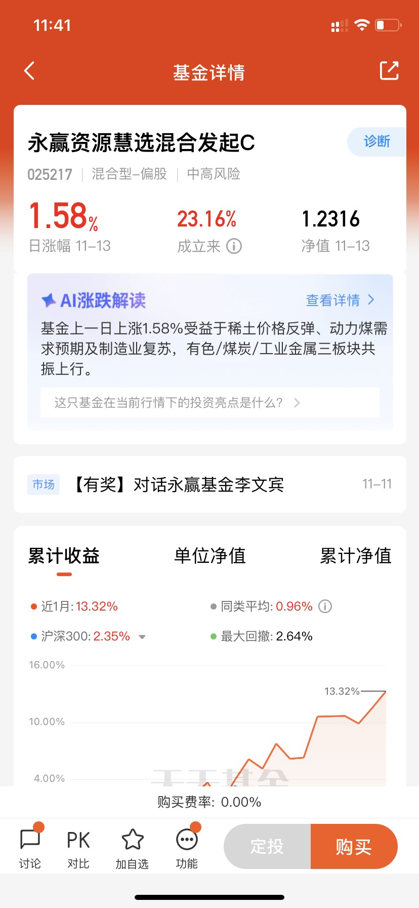 近期市场行情震荡,我发现$永赢资源慧选混合发起C$ 这里竟然稳健上涨,简直就是独立行情啊!昨天涨了1.58%,七天六涨,状态确实优秀,这里刚成立不久,近一个月涨了13.32%,同类平均0.96%,业绩表现远超同类平均表现!这里是新成立资源主题基金,行业配置集中,弹性比较强,值得关注了!#段永平:投资茅台不需要太看宏观环境#