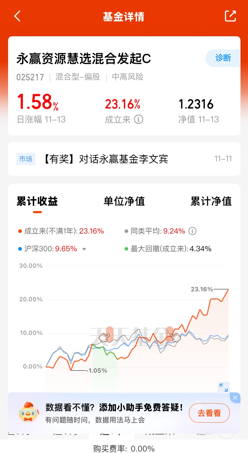 $永赢资源慧选混合发起C$昨天上涨1.58%,成立不到三个月收益超过23个点,近