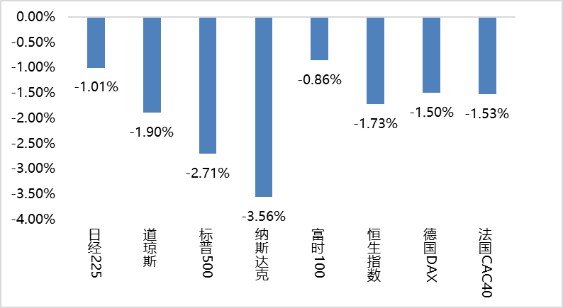 上周海外股市集体下跌。美国股市方面,道指下跌1.90%,标普500下跌2.71%,纳指下跌3.56%;欧洲股市方面,英国富时100下跌0.86%,德国下跌1.50%,法国下跌1.53%;亚太股市方面,日经指数下跌1.01%,恒生指数下跌1.73%。