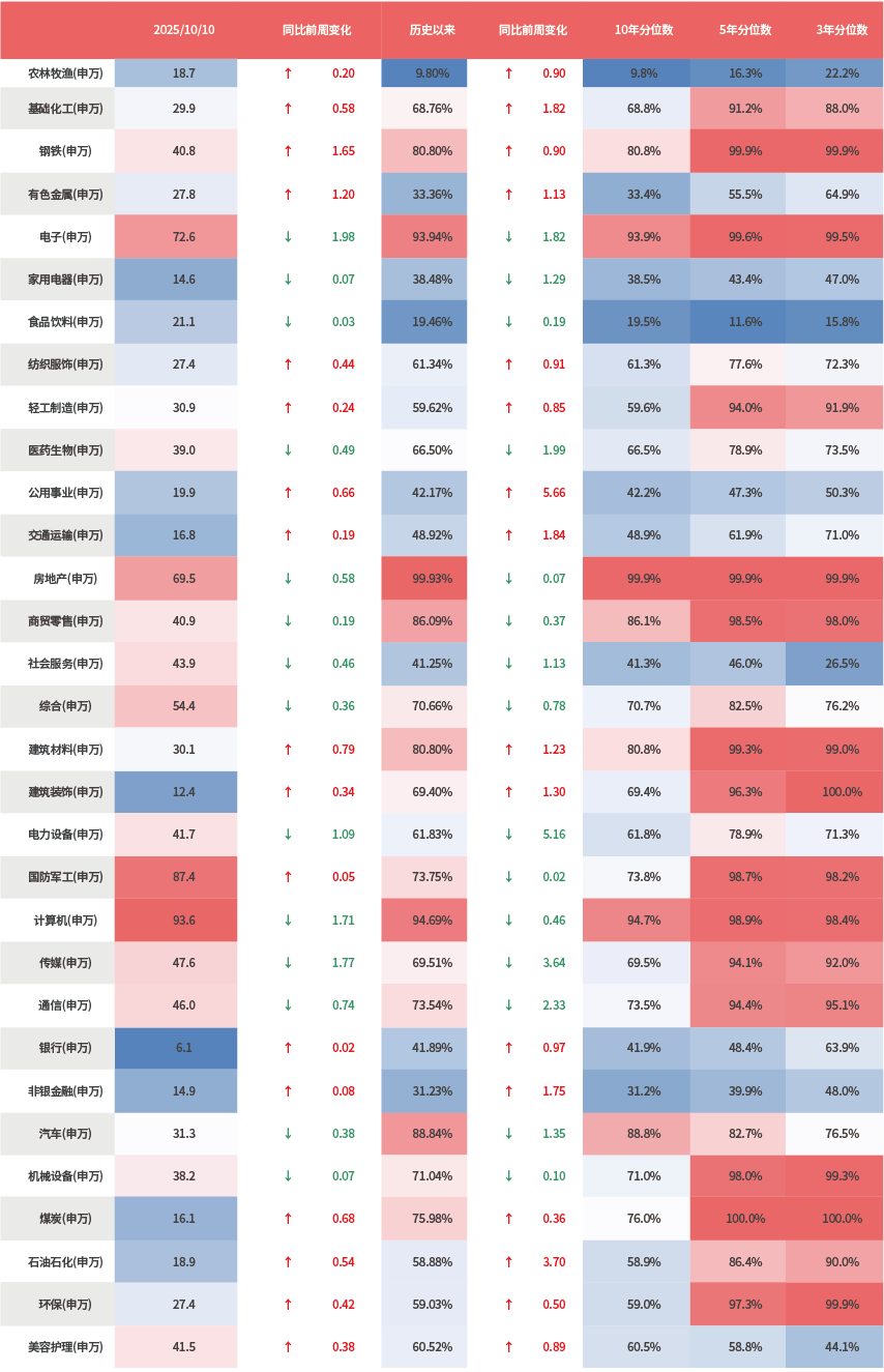 10月9日,两融资金占比为12.84%,9月30日为11.83%,反映出杠杆资金加仓意愿上升。截至10月10日,上周融资净买入的前三行业为电子、有色、电力设备。