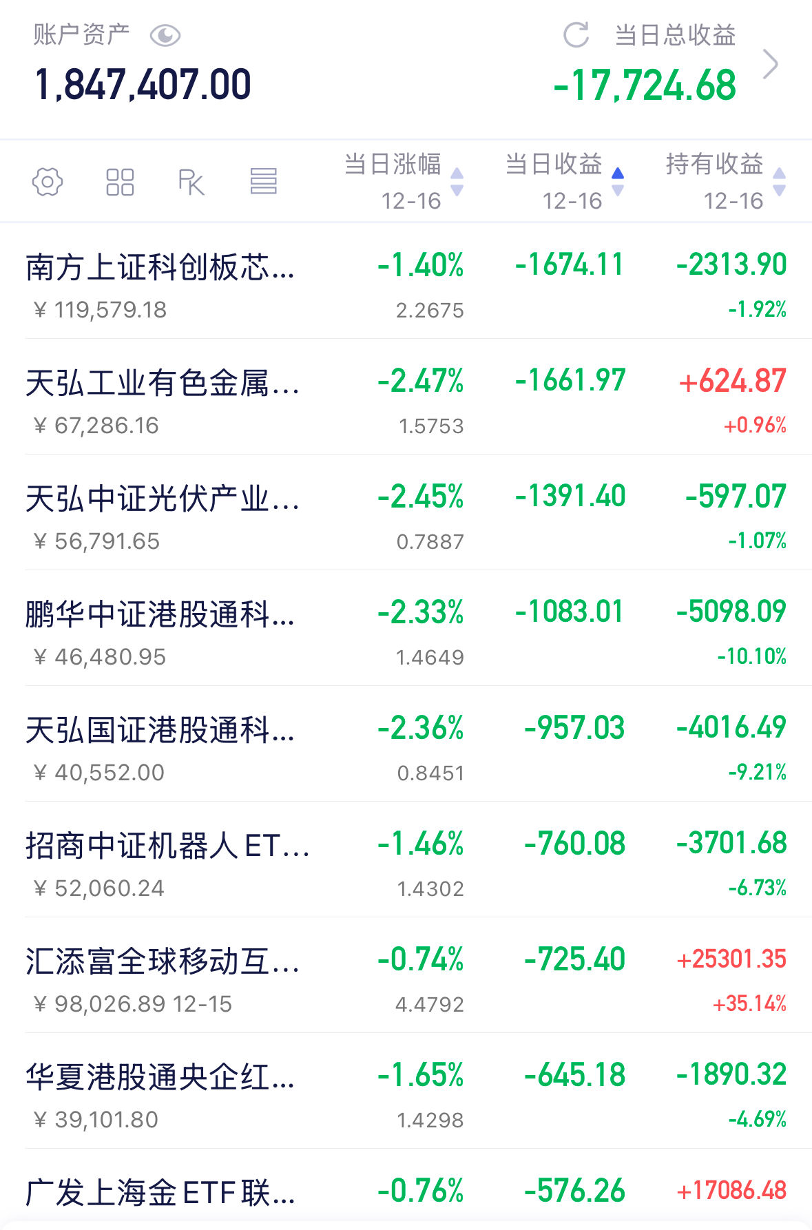 这两天砸的有些狠,要么涨的跟咱持有的没多大关系,要么持有的全跌,这谁遭得住啊。我为了提防高低切,除了少数几个成长方向外,也投了不少低估方向,但大跌来临时一样躲不掉,肉疼。
