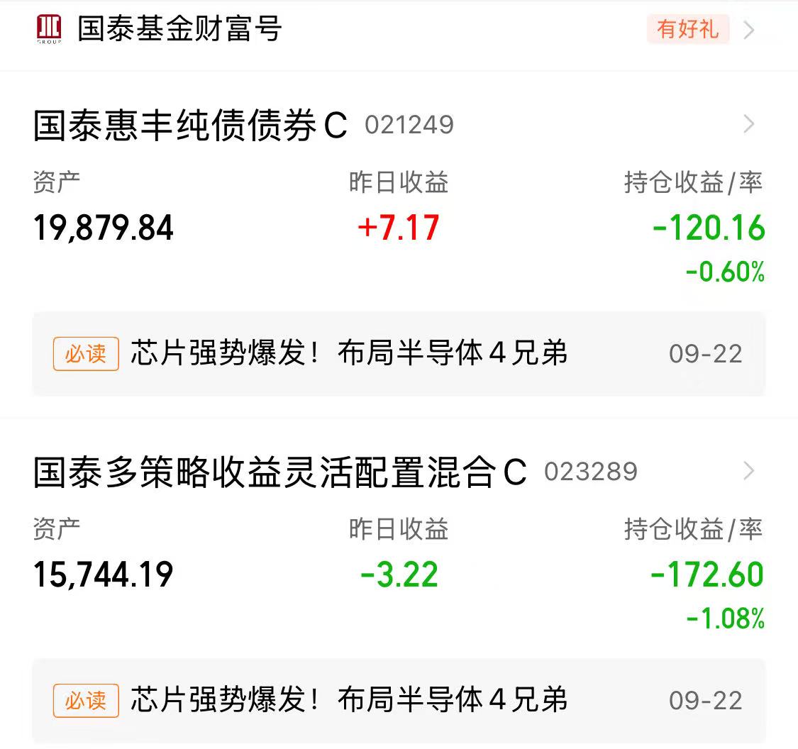 同时,国泰基金公司红利资产管理能力卓越,除了权益类产品之外,债权资产同样表现突出,无论是长债、中短债等均投资体验良好,我之前还申购了国泰基金明星基金经理胡志磊和王琳的国泰多策略收益灵活配置混合C(023289)和李铭一经理的国泰惠丰纯债债券C(021249),持仓金额将近40000元,是我目前持仓金额最高的两只债券基金,虽然目前尚未取得正收益,但是春种静待秋收。