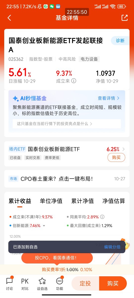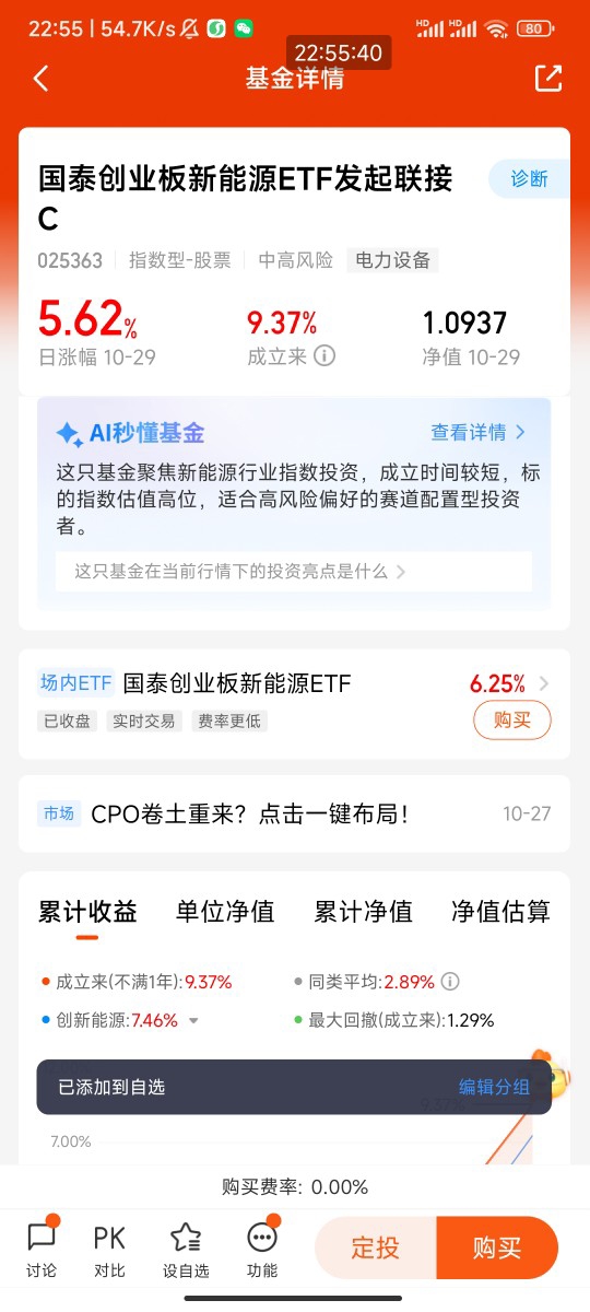 对于普通投资者,创业板新能源ETF联接基金是布局优质赛道的便捷工具。我选择国泰创业板新能源ETF发起联接A(025362) 作为核心配置,主要基于以下几点考虑: