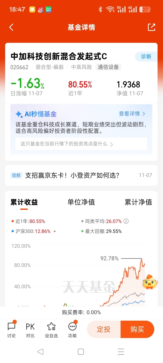 对比中加科技创新混合 C,后者由李宁宁管理,虽近 12 个月涨幅达 80.55% 但波动剧烈,11 月 7 日单日跌幅就有 1.63%中加基金管理有限公司。而中加北证 50 指数增强 C 依托北证 50 的政策红利与流动性改善趋势,成长确定性更高,风险更可控,适合长期把握硬科技成长机遇。@中加基金