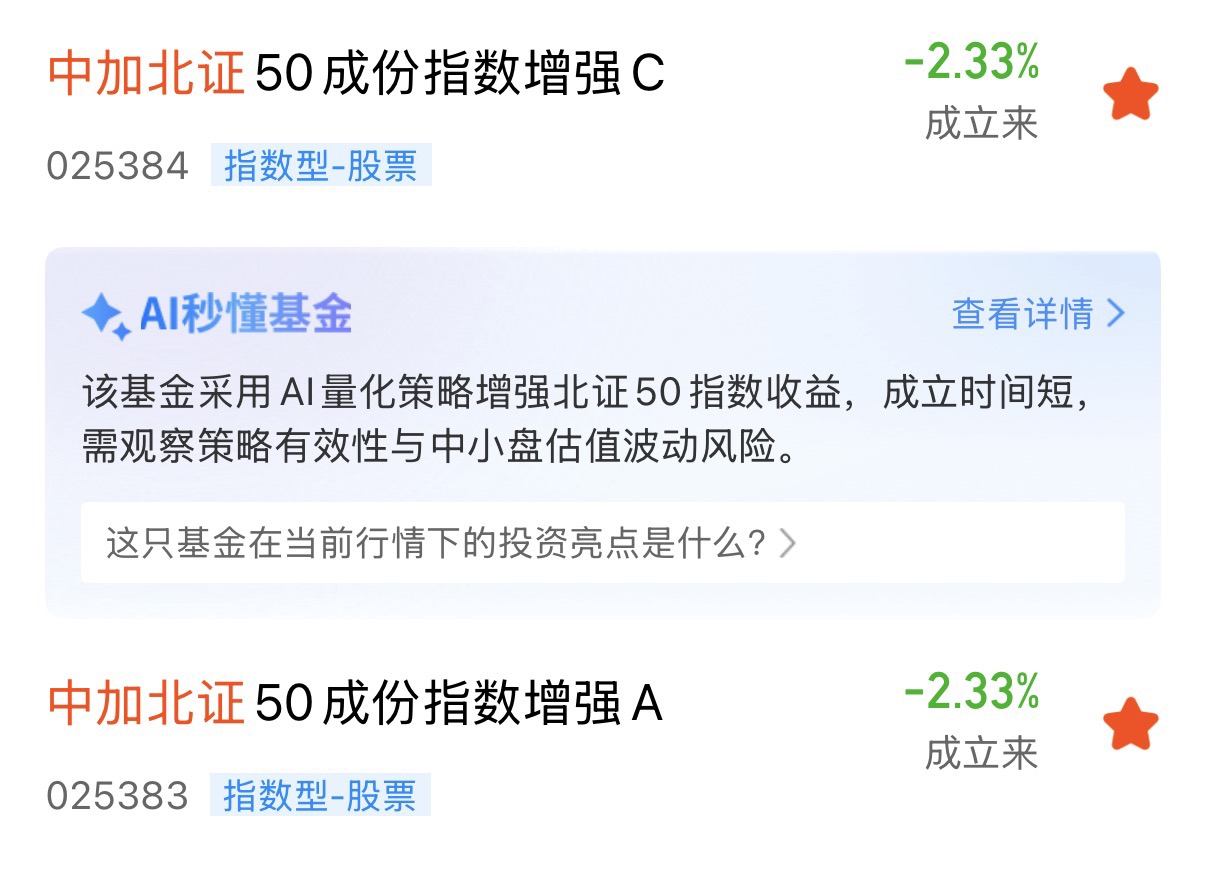 当然,投资没有稳赚不赔的买卖。大家还是要清醒地认识到,北交所的公司普遍处于高速成长期,波动大是客观事实。而且,最新的数据显示,北证50指数的PE已经达到了66.04倍,确实不算便宜了,这需要投资者有更强的风险承受能力和对高成长性的坚定信心。但如果你和我一样,看好中国这批“硬科技”小巨人的未来,相信它们在政策支持和产业升级浪潮中的成长潜力,愿意拿出一部分能承受波动的闲钱去分享它们可能的高成长,同时又希望借助专业机构的力量、通过分散投资(基金)和省心省力(指数增强)的方式来参与,同时降低些成本(相比频繁交易个股),那么我觉得,中加北证50成份指数增强基金(A类:025383,C类:025384),确实是一个值得你放进自选基金池、好好研究一下的投资工具。