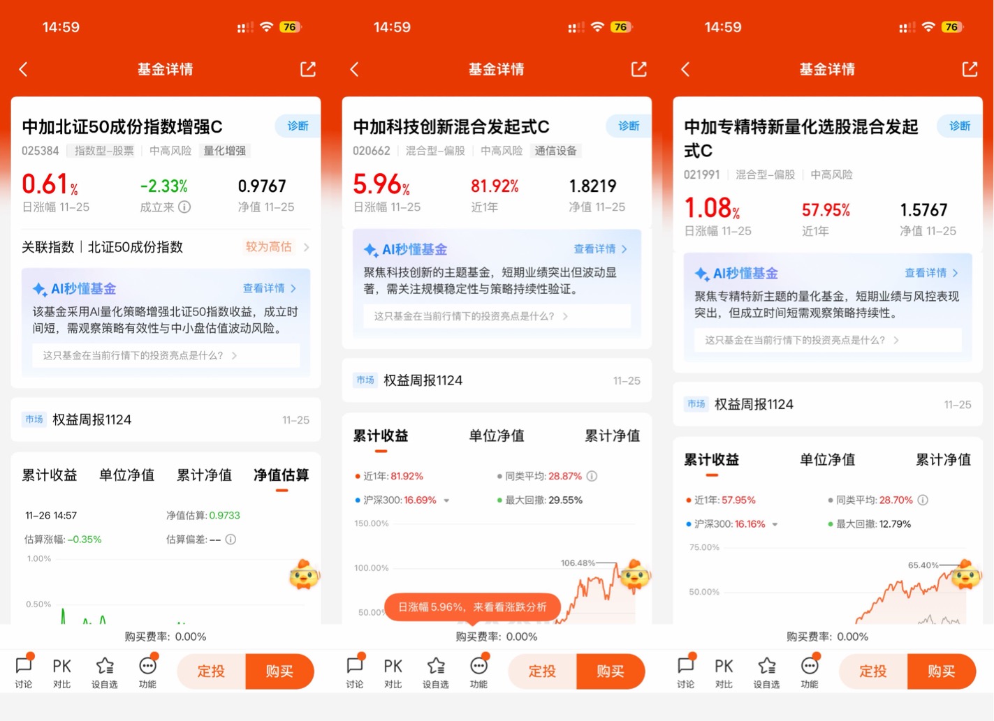 最初打动我的,其实是一个特别实在的点:它不限购! 你想想,市场上其他跟踪北证50的指数基金,动不动就限购,涨得好的时候不让买,想趁跌了补点仓也不给机会,那种憋屈劲儿,真是谁买谁知道。虽然中加这只指数增强基还只是一个新基金,成立还不到一个月,但架不住它表现亮眼啊!短短十几天,我关注到它的超额收益率就已经超过了3%,这种开局势头,在同类里确实不多见,不选它选谁?这让我感觉它的量化增强策略在初期就展现出了潜力。