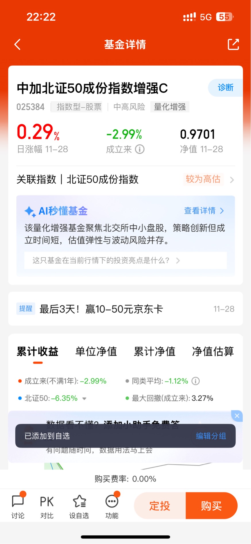 最直观的惊喜是它的牛市弹性。2024年10月北交所启动做市商制度改革,北证50指数迎来一波快速上涨,这只基金的净值涨幅比指数多了7个百分点,让我切实享受到了增强策略的超额收益。当时我的组合里,沪深300指数基金涨了15%,而这只基金的涨幅接近22%,成了组合里的“收益先锋”。