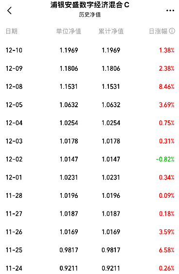 万万没想到啊!想着逢跌加仓呢,没想到$浦银安盛数字经济混合C(OTCFUND|025422)$今天收涨了1.38%,又跑赢一众同类,这可超出我的预期了,近13个交易日就小跌了一天,其余全部上涨,这次又6连涨啦!